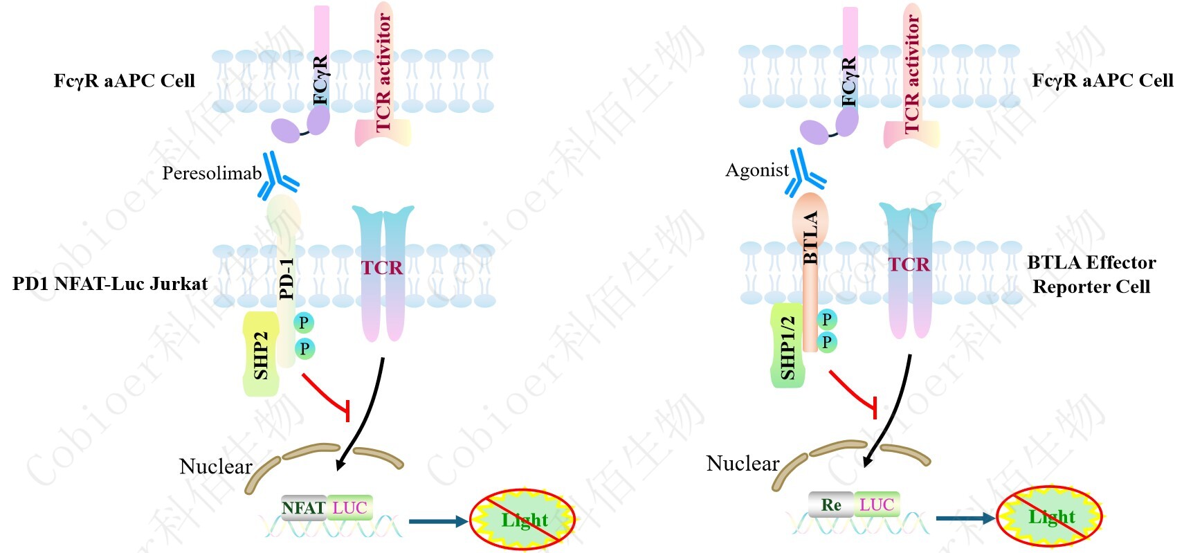 FcγR aAPC Cell在基礎(chǔ)細(xì)胞上穩(wěn)定表達(dá) FcγR 和 aAPC。FcγR aAPC Cell 作為 PD1 NFAT-Luc Jurkat Cell/BTLA Effector Reporter Cell 的靶細(xì)胞進(jìn)行功能檢測的原 理圖見下圖所示。![]() Figure 1. FcγR aAPC Cell 的原理圖 |