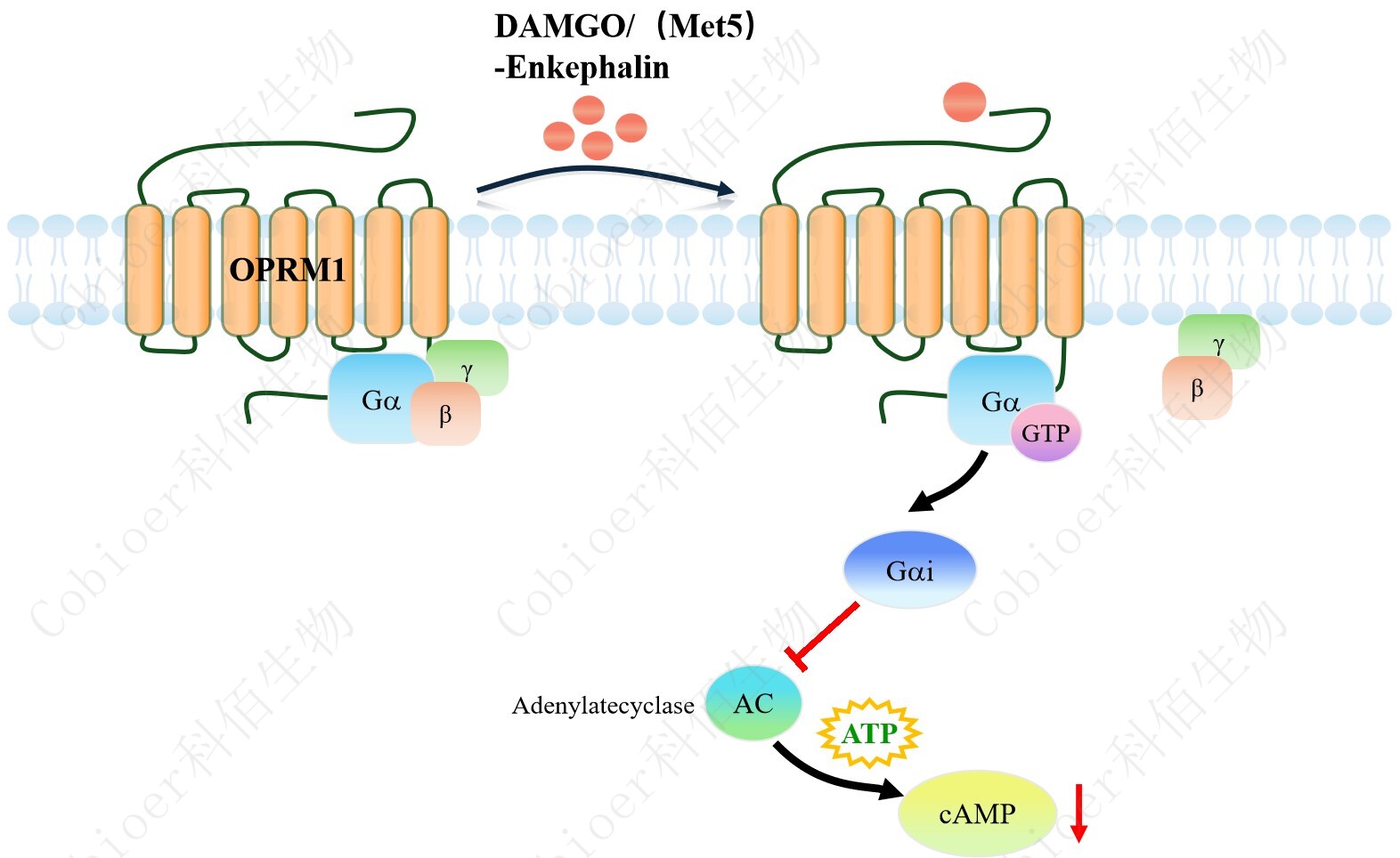 cAMP 在 G 蛋白偶聯(lián)受體(GPCR)信號(hào)轉(zhuǎn)導(dǎo)中是一種關(guān)鍵的第二信使。當(dāng)配體結(jié)合到 GPCR,構(gòu)象發(fā)生變化,激活受體接著激活 G 蛋白,Gi 的激活導(dǎo)致腺苷酸環(huán)化酶調(diào)控 cAMP 的下調(diào)。OPRM1 CHO 藥靶模型很好的模擬了體內(nèi) OPRM1 的信號(hào)轉(zhuǎn)導(dǎo)過(guò)程,原理見 下圖所示。 |