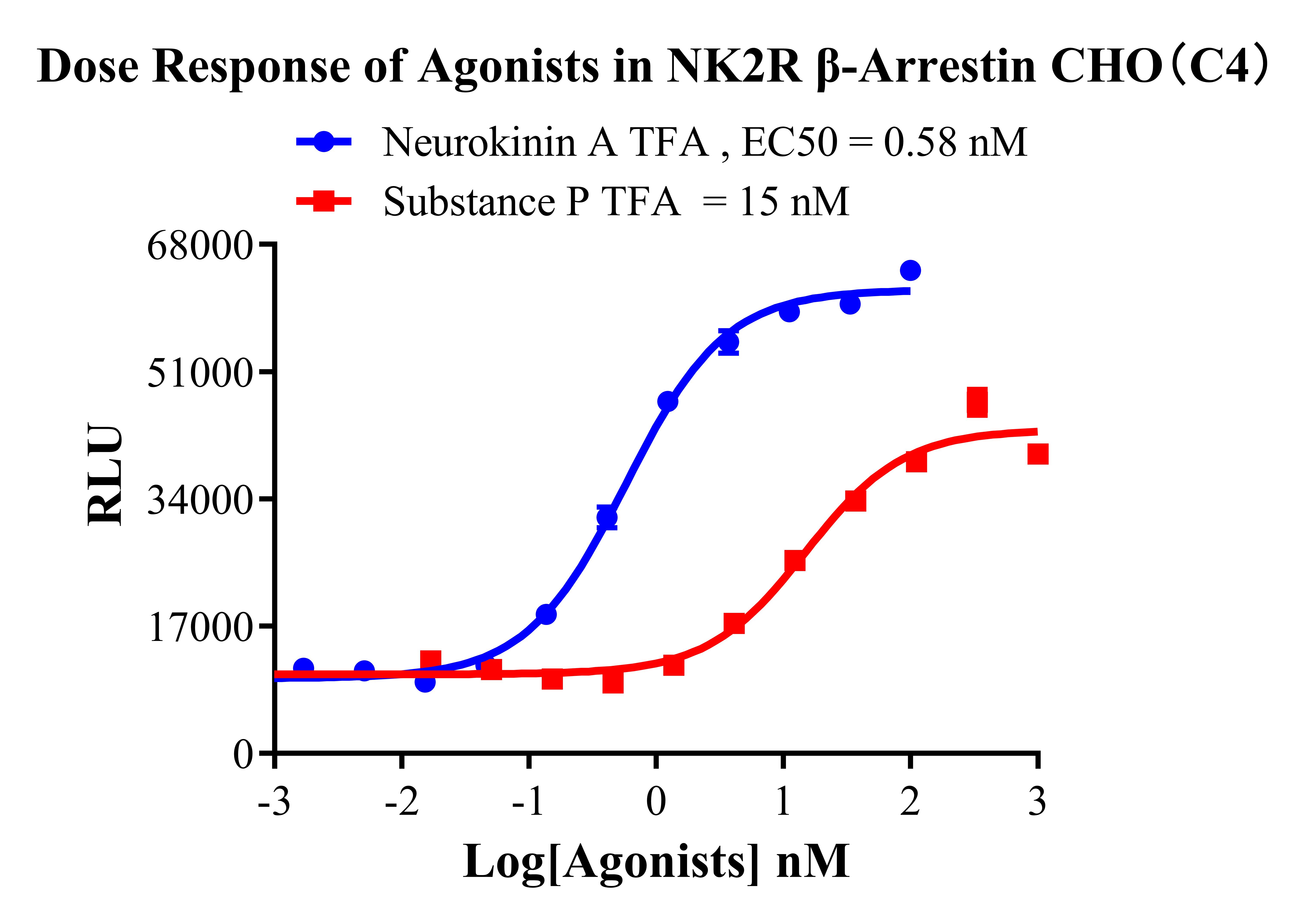 速激肽(Tachykinins )是分布在哺乳動物中樞和周圍神經系統(tǒng)中的一類神經肽。速激 肽物質 P(SP)、神經激肽 A(NKA)和神經激肽 B(NKB)共享一個保守的 C 端基序, 對速激肽受體(NK1R、NK2R 和 NK3R)的激活至關重要。NKA 優(yōu)先激活與 Gα偶聯的 NK2R,而 SP 和 NKB 分別優(yōu)先結合 NK1R 和 NK3R。三種速激肽都能夠在所有速激肽受 體類型中表現為完全激動劑。 NK2R 是一種 GPCR,普遍存在于中樞和周圍神經系統(tǒng),然而,有研究發(fā)現,NK2R 與 血紅蛋白 A1c(HbA1c)水平顯著相關。HbA1c 是評估長期血糖控制的重要指標,表明 NK2R 可能在糖代謝調控中發(fā)揮關鍵作用。 |