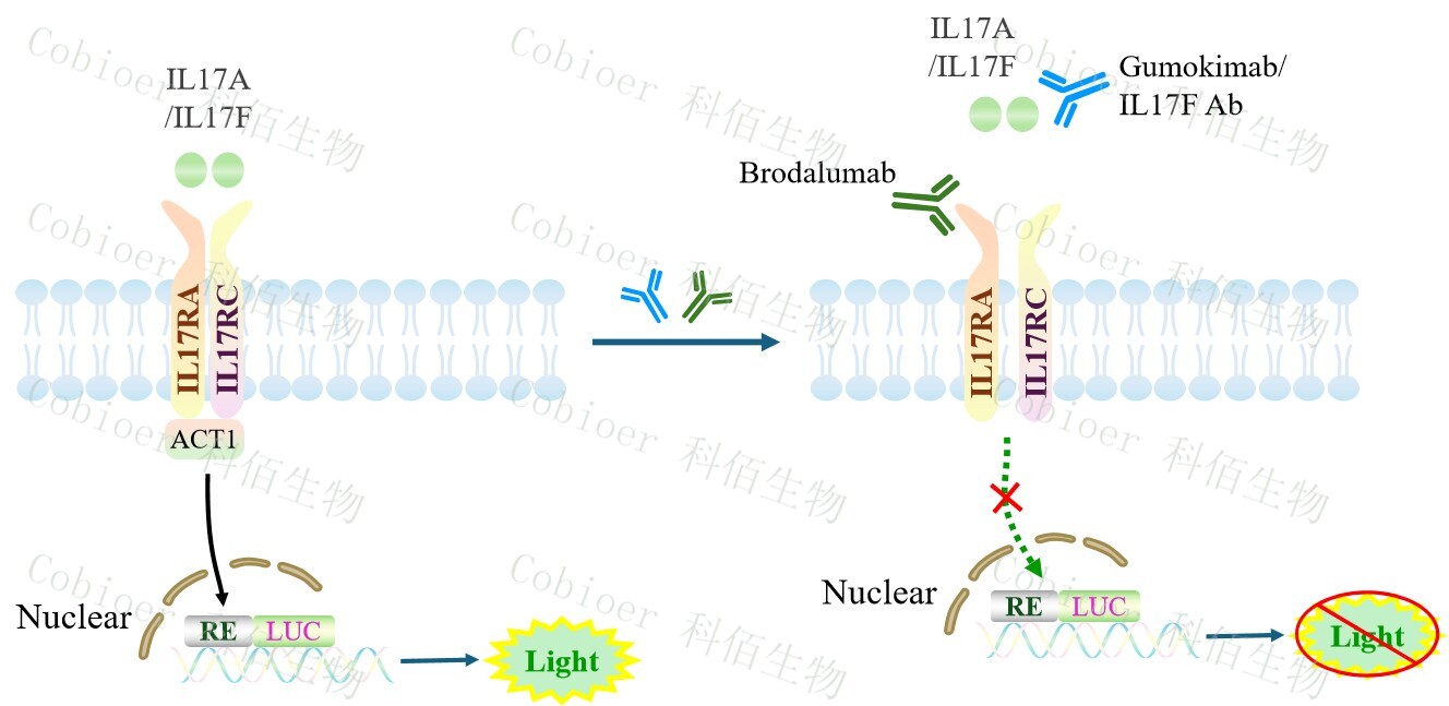 IL17A/17F Effector Reporter Cell 報告基因藥靶模型很好的模擬了體內(nèi) IL17A/17F 的信號轉導過程,原理見下圖所示。![]() Figure 1. IL17A/17F Effector Reporter Cell 細胞模型原理圖 |