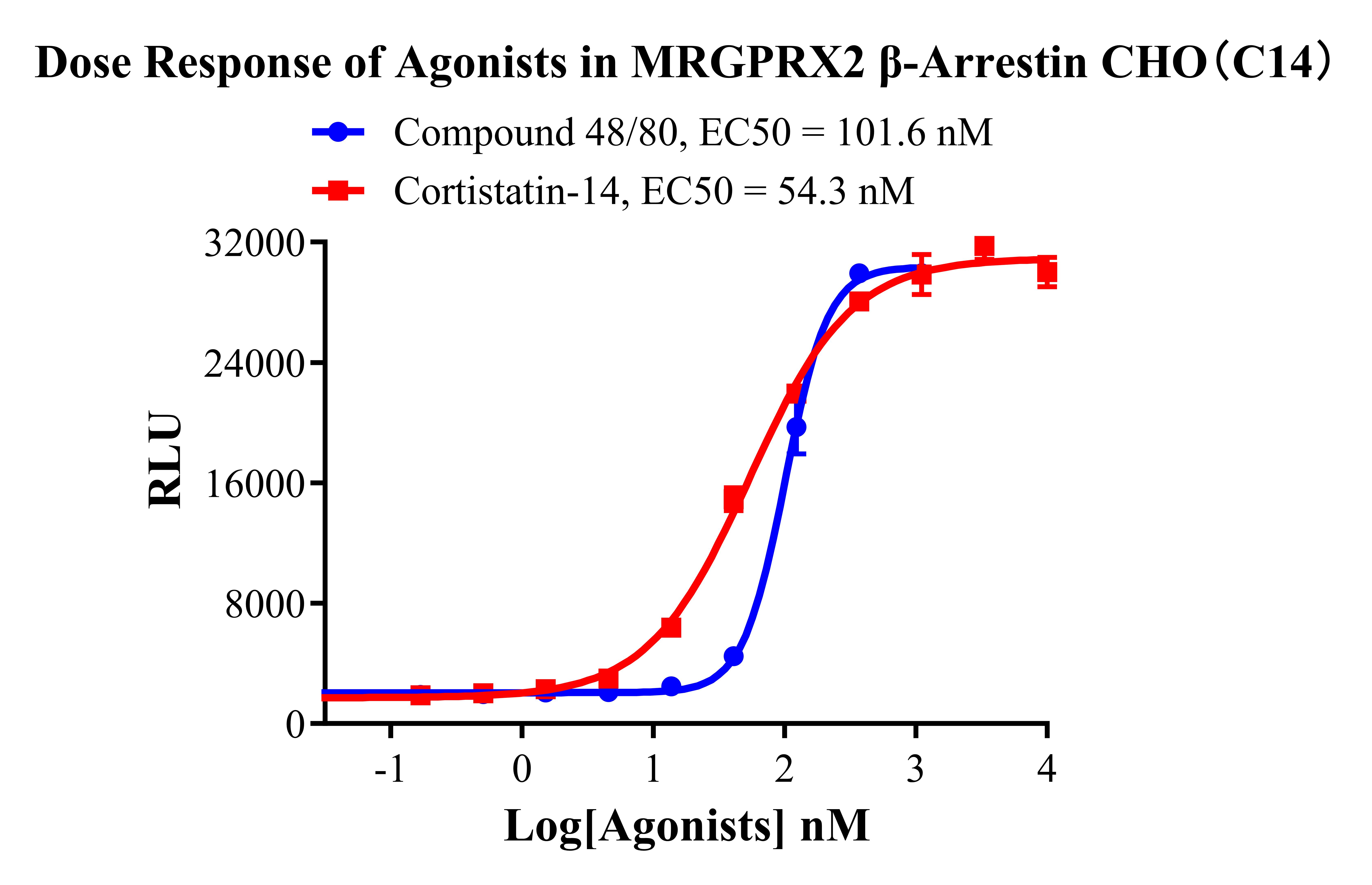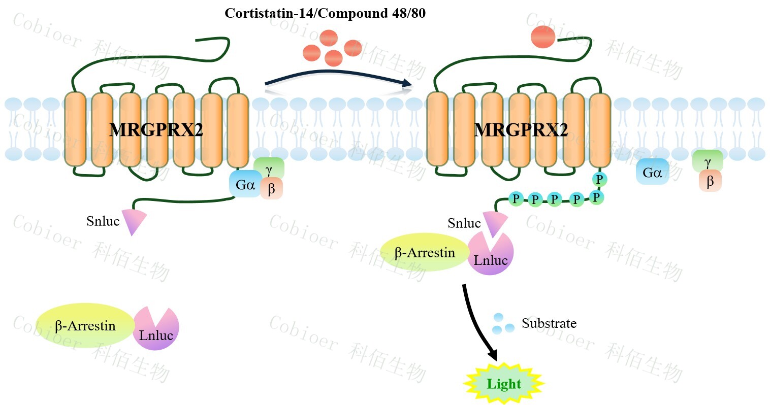 MRGPRX2 β-Arrestin CHO 報(bào)告基因藥靶模型很好的模擬了體內(nèi) MRGPRX2/β-Arrestin 的信號轉(zhuǎn)導(dǎo)過程,原理見下圖所示。當(dāng)缺乏配體刺激時(shí),β-Arrestin 不與 MRGPRX2 結(jié)合, 融合β-Arrestin 的熒光素酶處于失活構(gòu)象;當(dāng) MRGPRX2 遭遇配體刺激時(shí),融合熒光素酶報(bào) 告基因的β-Arrestin 被招募,使熒光素酶報(bào)告基因處于激活狀態(tài),加入其底物后發(fā)光信號增 強(qiáng)。![]() Figure 1. MRGPRX2 β-Arrestin CHO 細(xì)胞模型原理圖 |