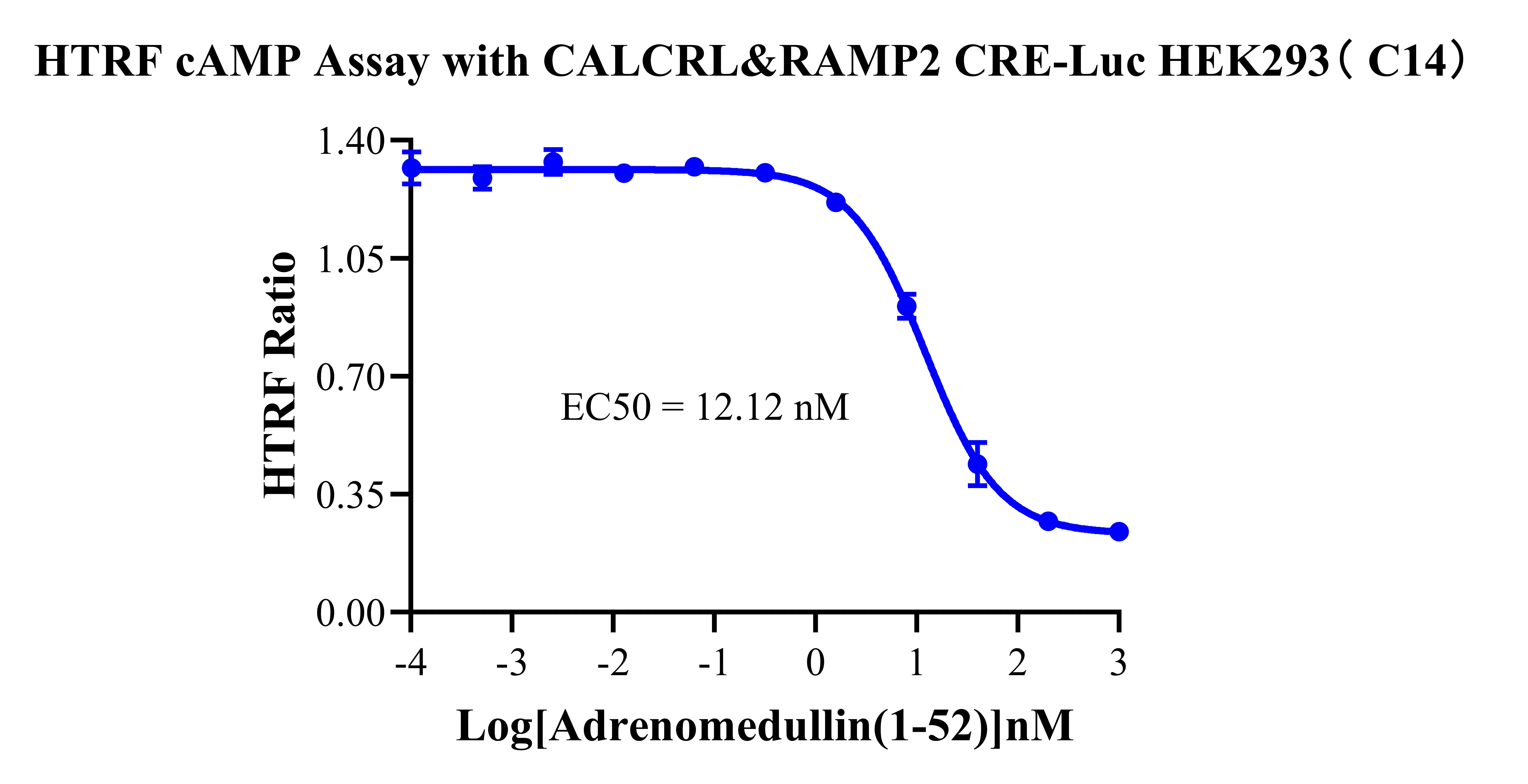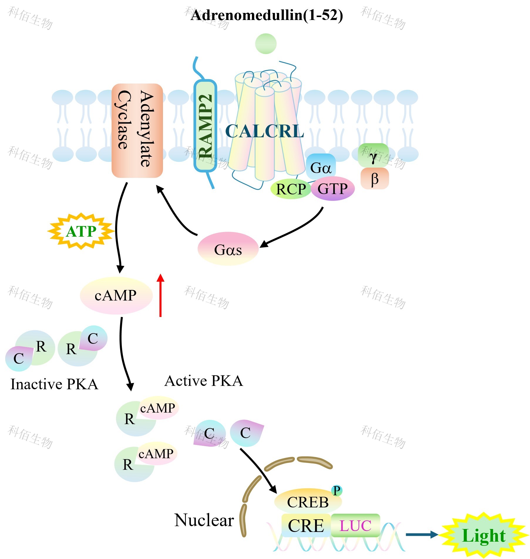 CALCRL&RAMP2 CRE-Luc HEK293 報(bào)告基因靶模型很好的模擬了體內(nèi) Adrenomedullin 的信號(hào)轉(zhuǎn)導(dǎo)過程,原理見下圖所示。