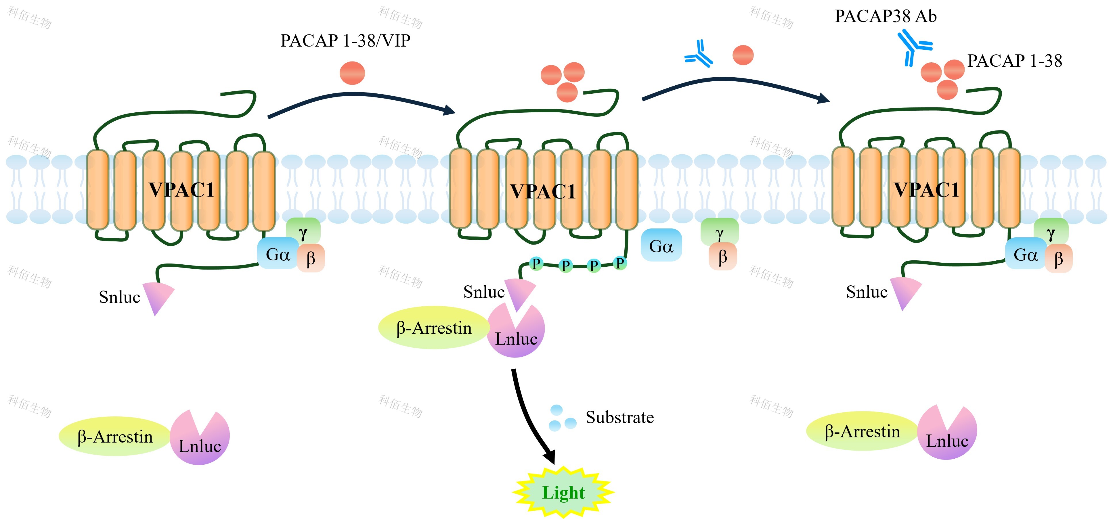 VPAC1 β-Arrestin CHO 報(bào)告基因藥靶模型很好的模擬了體內(nèi) VPAC1/β-Arrestin 的信號(hào)轉(zhuǎn)導(dǎo)過(guò)程,原理見(jiàn)下圖所示。當(dāng)缺乏配體刺激時(shí),β-Arrestin 不與 VPAC1 結(jié)合,融合β- Arrestin 的熒光素酶處于失活構(gòu)象,當(dāng) VPAC1 遭遇配體刺激時(shí),融合熒光素酶報(bào)告基因的 β-Arrestin 被招募,使熒光素酶報(bào)告基因處于激活狀態(tài),加入其底物后發(fā)光信號(hào)增強(qiáng)。![]() Figure 1. VPAC1 β-Arrestin CHO 細(xì)胞模型原理圖 |
