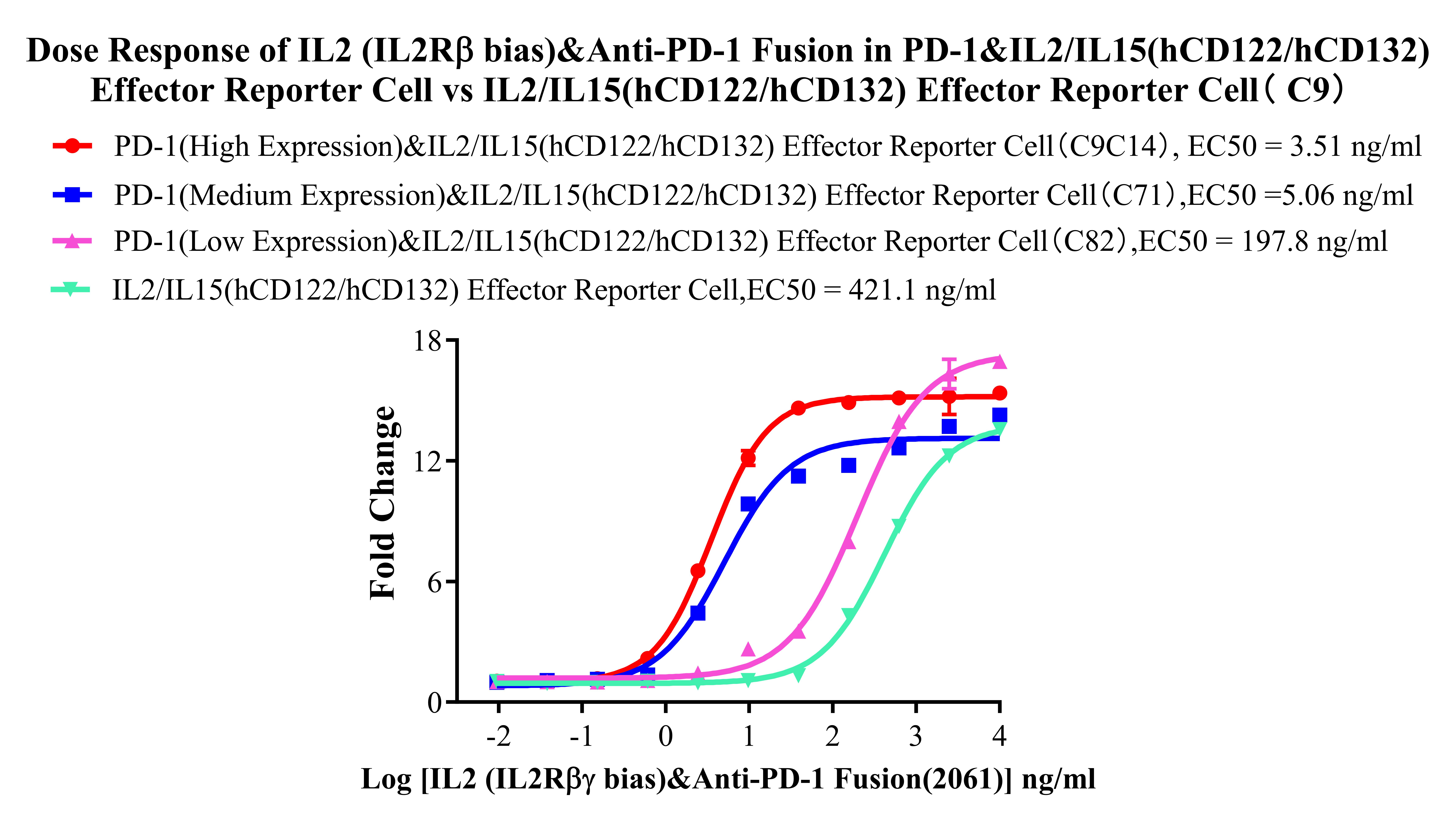 ![]() Figure 5. Dose Response of IL2 (IL2Rβγ bias)&Anti-PD-1 Fusion in PD-1&IL2/IL15(hCD122/hCD132 Effector Reporter Cell(C9C14) vs IL2/IL15(hCD122/hCD132) Effector Reporter Cell(C9). ![]() Figure 6. Dose Response of IL2 (lL2Rβ bias)&Anti-PD-1 Fusion in PD-1&IL2/IL15(hCD122/hCD132) Effector Reporter Cell vs IL2/IL15(hCD122/hCD132) Effector Reporter Cell(C9).