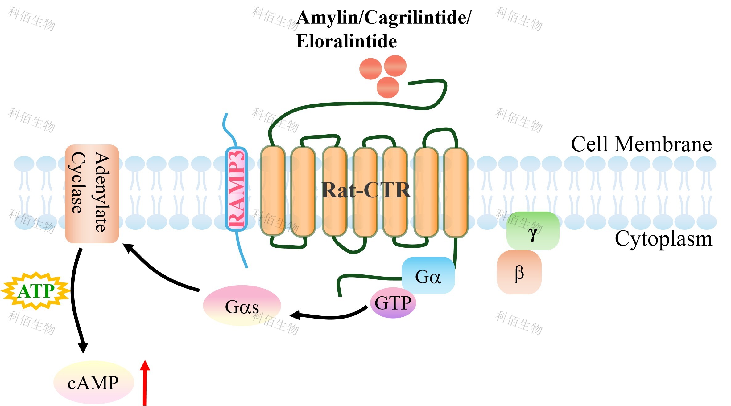 | 降鈣素基因相關肽(CGRP)家族包括 CGRP 本身、降鈣素(CT)、腎上腺髓質素 (AM)和胰島淀粉樣肽(AMY)。 胰淀素(Amylin)受體的三種類型的已被確定,即 AMY1,AMY2 和 AMY3。 胰淀素受體屬于 B 類 GPCR,是異二聚體復合物,由降鈣素受體(CTR)與受體活性修飾蛋白 (RAMPs)結合形成。該受體的 CTR 組分具有相同的 GPCR 結構:7 個跨膜相互連接的α- 螺旋,將細胞外信號傳遞到細胞內細胞質信號級聯。RAMP 有三種類型(RAMP1、 RAMP2 和 RAMP3),它們共享 31%的氨基酸序列,具有相似的基本結構。RAMP 是將 CTR 轉運到細胞膜并調節(jié)其配體特異性的重要肽,它可以改變特定 GPCR 的藥理學、功能和細胞運輸。 哺乳動物細胞中 Amylin 受體的激活已被證明可以提高 cAMP,并被認為與 Gs 蛋白和腺苷酸環(huán)化酶的刺激有關。在 RAMPs 的存在下,其與胰淀素的結合親和力可以被修飾。 CTR 和 RAMP1 或 CTR 和 RAMP3 的異質結構被認為有利于與胰淀素結合,介導大腦中的生理功能。AMY3 的激活刺激 G 蛋白 Gαs,進一步控制腺苷酸環(huán)化酶(AC),隨后增加細 胞 cAMP。cAMP 與 PKA 調控亞基(R2)的結合誘導 PKA 四聚體全酶解離,導致 PKA 催化亞基的激活。cAMP 激活的 PKA 參與調控 ERK1/2 的活性。ERK1/2 通路的觸發(fā)可能導致 Ca 2+分布不均勻,引發(fā)內質網和線粒體功能障礙,導致細胞死亡。此外,cAMP 刺激 AKT 進一步導致轉錄因子 cFos 的表達。 |