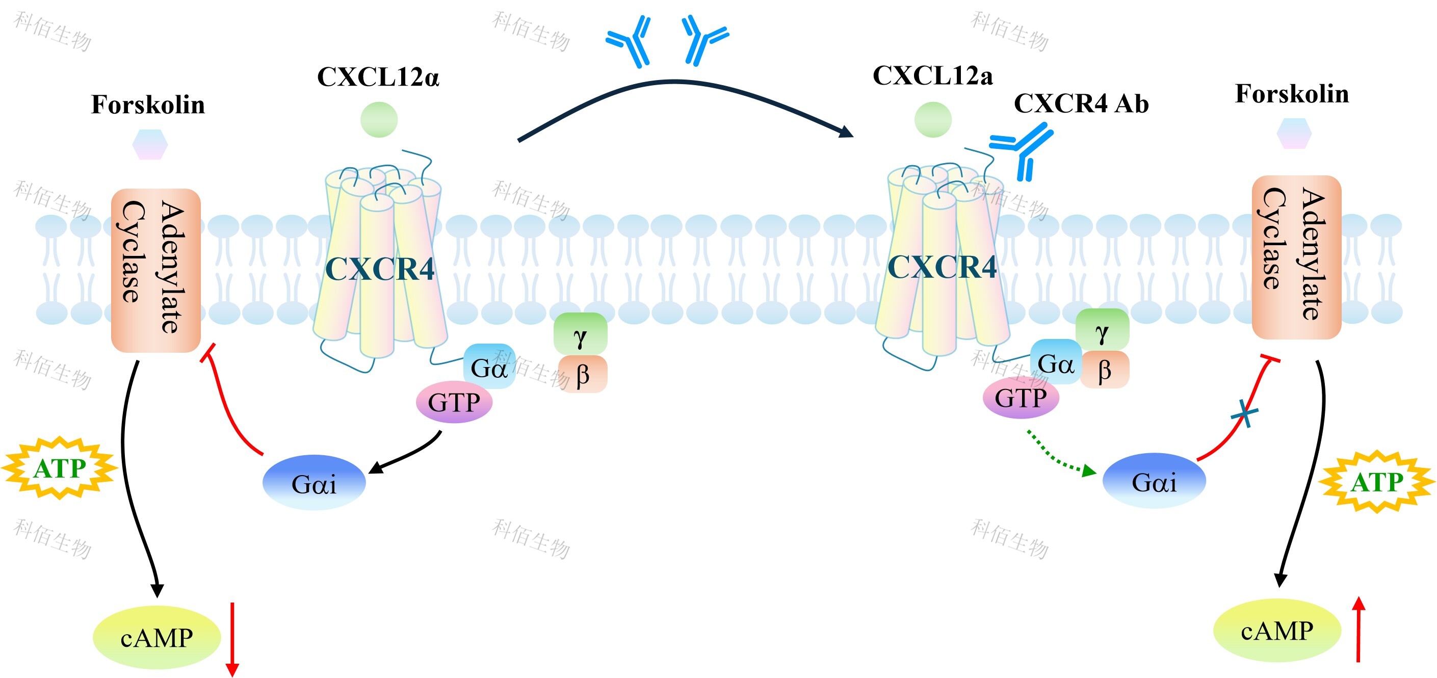 | CXCR4(C-X-C 趨化因子受體 4 型)是一種在人體內(nèi)廣泛表達(dá)的蛋白質(zhì),屬于 GPCR 家族,具有典型的七次跨膜結(jié)構(gòu)。它的專屬配體是 CXCL12(也稱 SDF-1,基質(zhì)細(xì)胞衍生 因子-1)。在生理狀態(tài)下,CXCR4 在免疫細(xì)胞(如 T 細(xì)胞、B 細(xì)胞)、造血干細(xì)胞以及多種組織中均有表達(dá),主要負(fù)責(zé)調(diào)控細(xì)胞的遷移、歸巢和滯留,在免疫應(yīng)答、胚胎發(fā)育以及造血干細(xì)胞的骨髓錨定中扮演著至關(guān)重要的角色。 當(dāng) CXCL12 與 CXCR4 結(jié)合后,會引發(fā)受體構(gòu)象改變,進(jìn)而激活細(xì)胞內(nèi)多條信號通路。首先,受體偶聯(lián)的 G 蛋白被激活,進(jìn)而抑制細(xì)胞凋亡并促進(jìn)存活;同時,PI3K/AKT 和 MAPK/ERK 通路被激活,促進(jìn)細(xì)胞增殖、遷移和相關(guān)基因表達(dá);此外,鈣離子的流動也會被觸發(fā),直接驅(qū)動細(xì)胞的趨化運動,使其朝著高濃度 CXCL12 的方向定向遷移。這一完整 的信號傳導(dǎo)過程被稱為 CXCL12/CXCR4 信號軸。 |