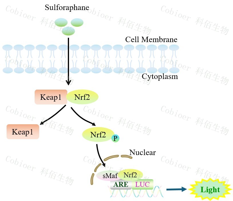 ARE-Luc(Nrf2 Antioxidant Pathway) HEK293 報告基因細(xì)胞,是由 ARE 調(diào)控并表達(dá) Luc 熒光素酶報告基因的 HEK293 細(xì)胞。Sulforaphane 是 Keap1/Nrf2/ARE 的誘 導(dǎo)劑,原理見下圖所示。![]() Figure 1. ARE-Luc(Nrf2 Antioxidant Pathway) HEK293 細(xì)胞模型原理圖