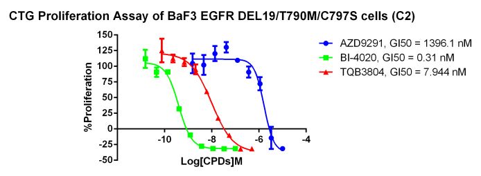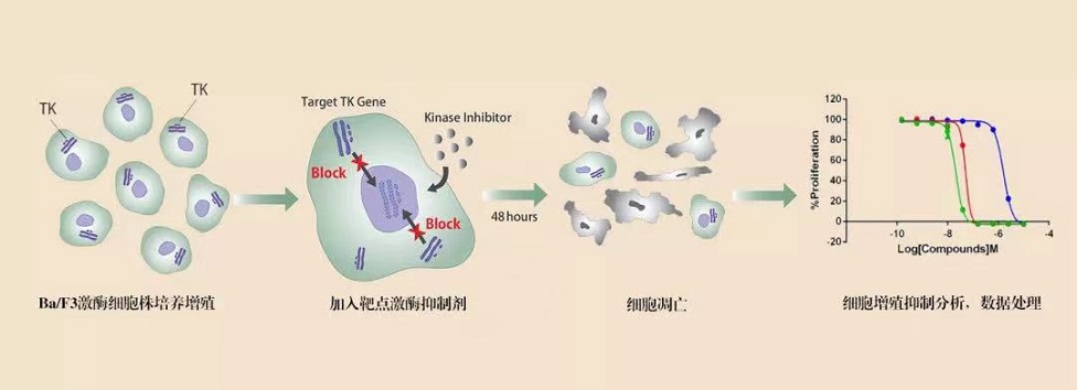 我們結(jié)合自己多年在細胞領(lǐng)域的豐富經(jīng)驗,在 Ba/F3(小鼠原B細胞)上進行改造,引入相應(yīng)表達激酶基因,這些基因能作為Ba/F3的驅(qū)動基因,讓Ba/F3不再依賴IL-3而增殖,進而激酶基因成為Ba/F3增殖依賴的驅(qū)動基因,用于評估小分子藥物對激酶的靶向抑制作用。