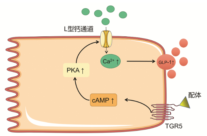 TGR5在維持葡萄糖穩(wěn)態(tài)和胰島素敏感性方面上的效果已得到廣泛證明。例如,使用TGR5激動劑6α-乙基-23(S)-甲基-膽酸(6α-ethyl-23(S)-methyl-cholic acid,INT-777)可以提高肥胖小鼠的胰島素敏感性,7-硫酸膽酸以TGR5依賴性方式增加胰島素抵抗小鼠的葡萄糖耐量等。機體各組織的TGR5可通過不同的分子機制參與血糖代謝的調(diào)節(jié)。TGR5對于血糖代謝的作用,主要與腸促胰島素釋放相關(guān),通過刺激腸內(nèi)分泌L細(xì)胞分泌GLP-1來實現(xiàn)。既往研究發(fā)現(xiàn),GLP-1可促進(jìn)胰島素分泌,促進(jìn)胰島β細(xì)胞存活和增殖,抑制細(xì)胞凋亡,并且可有效刺激2型糖尿病患者的胰島素分泌并降低血糖。早期觀點認(rèn)為TGR5被激活后刺激腸內(nèi)分泌L細(xì)胞內(nèi)cAMP水平增加,線粒體氧化磷酸化增加,ATP/ADP比例增加,導(dǎo)致ATP依賴性鉀離子通道(KATP)關(guān)閉,開放鈣離子通道,促進(jìn)鈣離子內(nèi)流,釋放GLP-1。但后續(xù)大量研究驗證了GLP-1的分泌確實與cAMP升高,胞內(nèi)鈣離子升高有關(guān),但與ATP依賴性鉀離子通道無關(guān)。Brighton等的實驗進(jìn)一步驗證了GLP-1分泌與L細(xì)胞內(nèi)的cAMP和Ca2+濃度變化有關(guān),并且說明了該作用主要由位于基底外側(cè)L細(xì)胞膜上的TGR5介導(dǎo)。近年來,Goldspink等發(fā)現(xiàn)腸L細(xì)胞上的TGR5被激活后,通過cAMP/PKA途徑,開放了L型Ca2+通道,促進(jìn)Ca2+內(nèi)流,引發(fā)GLP-1分泌。