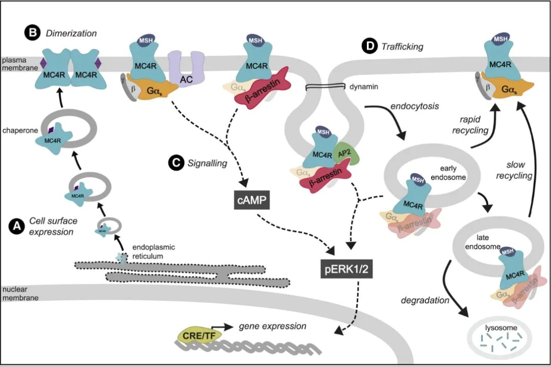 MC4R (黑皮質(zhì)素4受體) 是黑皮質(zhì)素受體家族成員之一,其家族屬于視紫紅質(zhì)樣A類GPCR,成員還包括:MC1R、MC2R、MC3R和MC5R。黑皮質(zhì)素受體 (MC1R-MC5R) 位于多種細(xì)胞類型上,并遍布大多數(shù)身體系統(tǒng)。MC4R是中樞黑皮質(zhì)素系統(tǒng)的重要組成部分,主要在下丘腦室旁核(PVH)中表達(dá),是一種A類GPCR。在高能量平衡狀態(tài)下,阿片黑皮質(zhì)素原 (POMC) 神經(jīng)元釋放多肽MC4R激動劑-α-黑素細(xì)胞刺激激素(α-MSH)。α- MSH與MC4R結(jié)合會激活MC4R信號傳導(dǎo),抑制食欲和食物攝入。在低能量平衡狀態(tài)下,下丘腦室旁核中釋放AgRP (agouti-related peptide)。AgRP作為MC4R與α- MSH結(jié)合的競爭性拮抗劑,也是MC4R反向激動劑,抑制MC4R信號傳導(dǎo)。