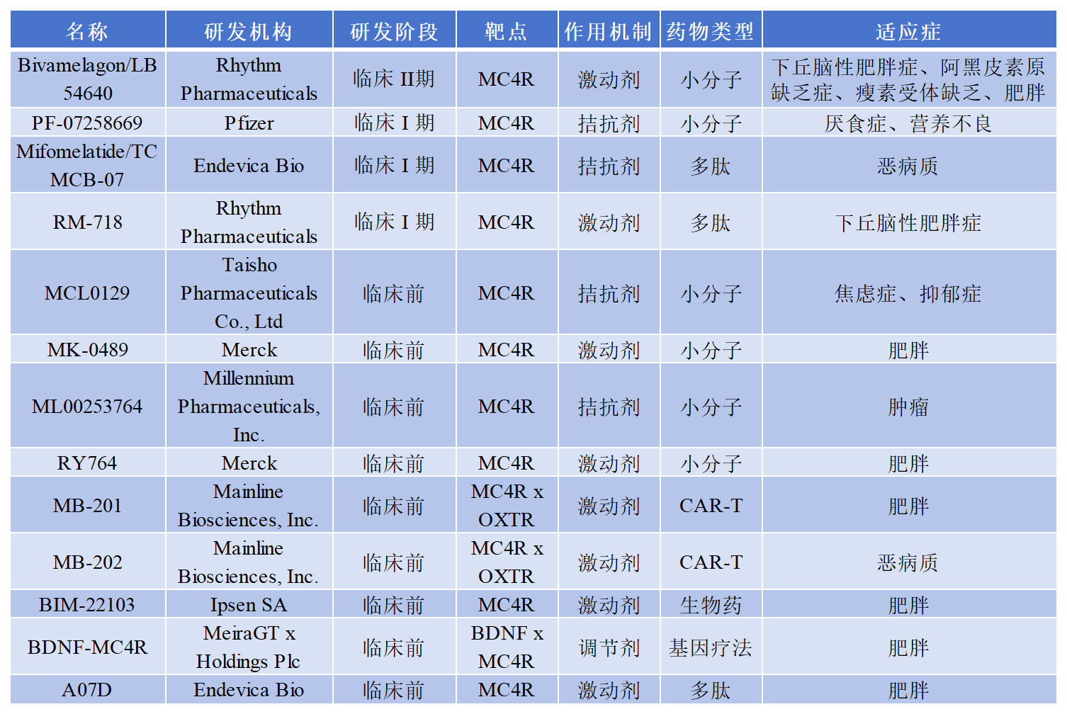 除去臨床階段終止及無進(jìn)展的幾款藥物,目前共有多款處于臨床及臨床前的靶向MC4R的藥物,既有小分子藥物也有多肽類藥物。部分信息如下: