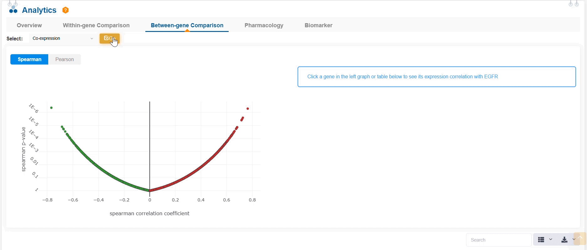 b). 在兩個層面比較基因組學數(shù)據(jù):通路活性與通路活性對比mRNA表達——通過點擊交互式圖表實時探索并定制可視化效果:在通路活性層面,計算所有通路活性評分之間的相關(guān)性;在通路活性對比mRNA表達層面,計算所有基因表達與目標通路之間的相關(guān)性。您可根據(jù)需要在斯皮爾曼相關(guān)系數(shù)與皮爾遜相關(guān)系數(shù)方法間切換。