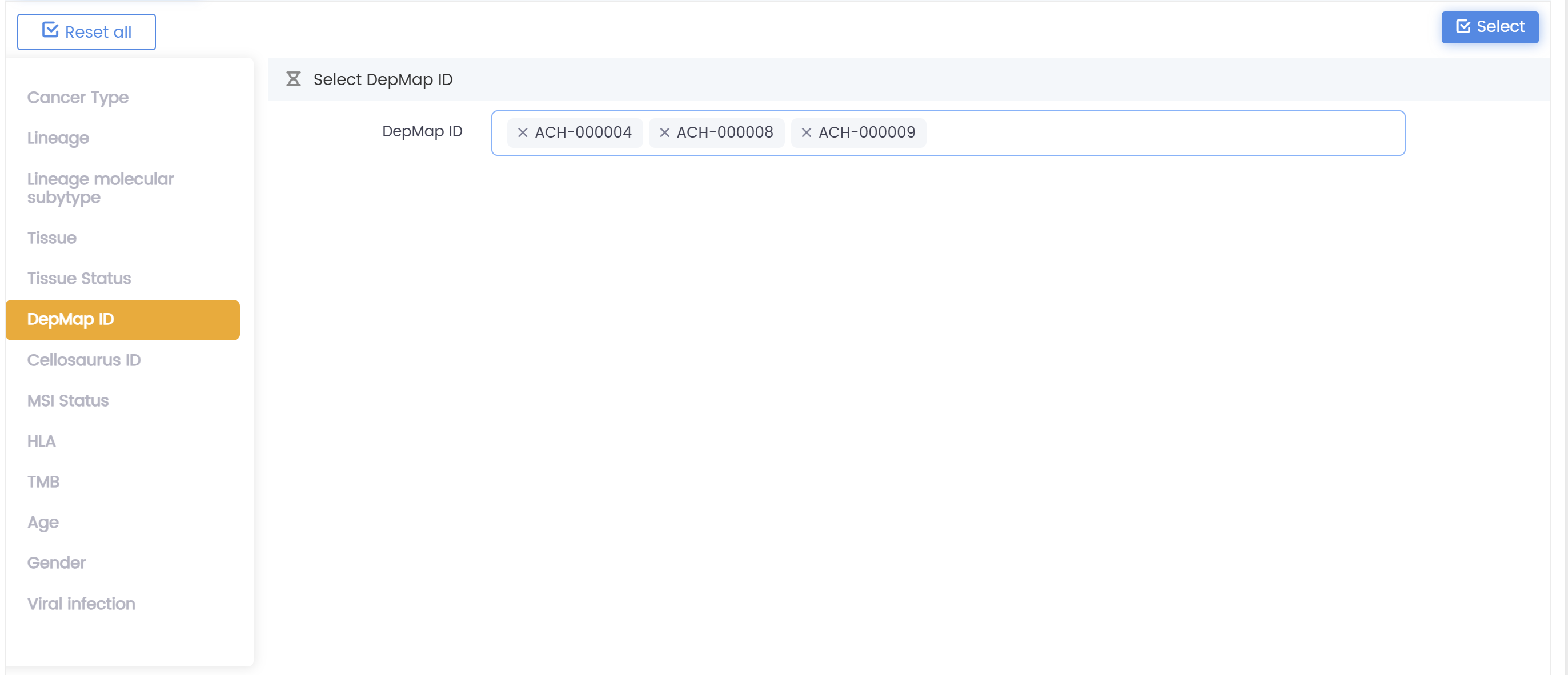 2.根據(jù)癌癥類型、譜系、亞型、組織、性別、年齡、病毒感染及其他相關(guān)因素篩選樣本。點擊右上角的"選擇"按鈕確認篩選條件。下圖中包含所有癌癥類型,篩選條件僅應用于患者年齡介于7.6至70.1歲的病例。