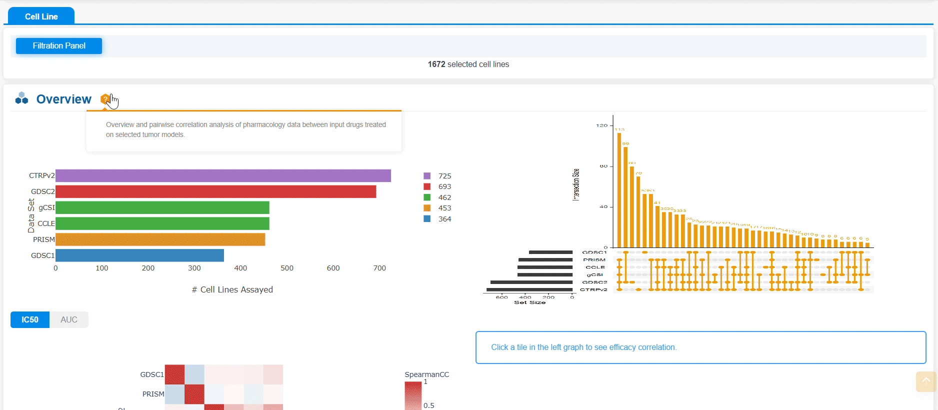 3.查看目標藥物的可用數(shù)據(jù)集:左上圖顯示每個數(shù)據(jù)集中針對該藥物測試的模型數(shù)量;右上圖展示多個數(shù)據(jù)集中共同測試的模型數(shù)量;左下圖基于IC50或AUC測量的療效,展示數(shù)據(jù)集間的成對相關(guān)性。點擊左下圖中的任意圖塊,將在右下圖生成對應的療效相關(guān)性圖。