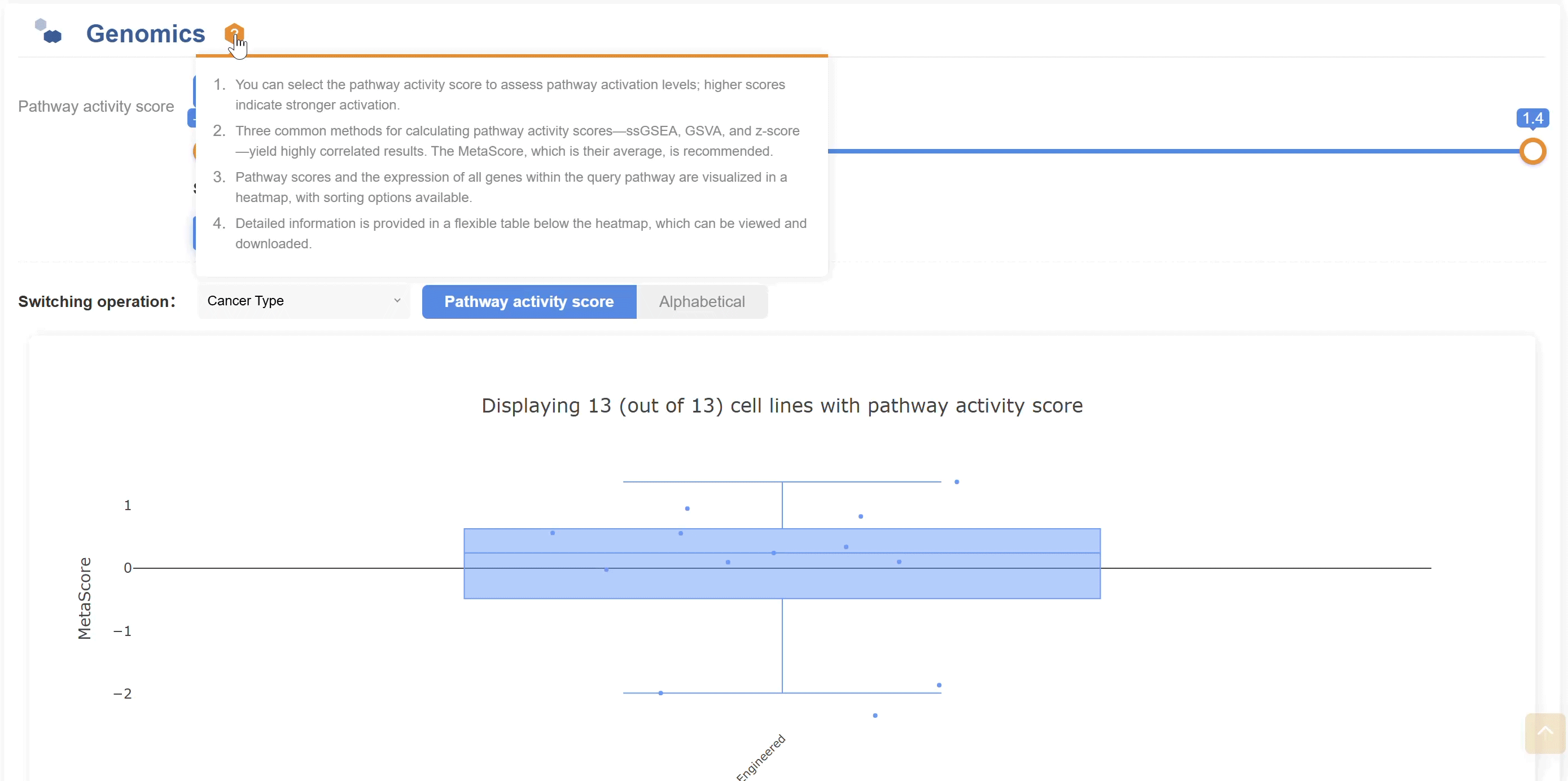 3.滑動選擇通路活性評分范圍以評估通路激活水平——評分越高對應激活越強。三種主要計算方法(ssGSEA、GSVA和z-score)顯示出強相關(guān)性;建議采用其平均值——MetaScore。點擊“篩選”應用選擇,或點擊“重置”清除并重新開始。
