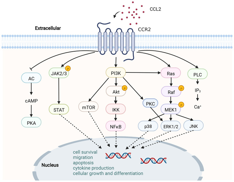 通過結(jié)合CCL2,CCR2經(jīng)歷二聚化和內(nèi)化,誘導(dǎo)單核細胞趨化蛋白-1誘導(dǎo)蛋白-1(MCPIP1)的表達。隨后,MCP1P1開始轉(zhuǎn)錄和表達IL-1、CCL2和TNF基因。當(dāng)CCL2觸發(fā)CCR2時,會啟動多種細胞內(nèi)G蛋白介導(dǎo)的信號通道,例如JAK/STAT、PI3K/MAPKs和PI3K/Akt/ERK/NF-κB。這些信號通路的激活會激活多種轉(zhuǎn)錄因子和基因,這些因子參與細胞因子產(chǎn)生、細胞生長與分化、細胞存活、遷移與凋亡、血管生成及炎癥。CCL2-CCR2軸與多種疾病的進展相關(guān),如動脈粥樣硬化、急性肝衰竭、類風(fēng)濕性關(guān)節(jié)炎、肺動脈高壓、糖尿病及并發(fā)癥以及癌癥。因此,CCL2-CCR2軸被認為是此類疾病管理的潛在靶點。