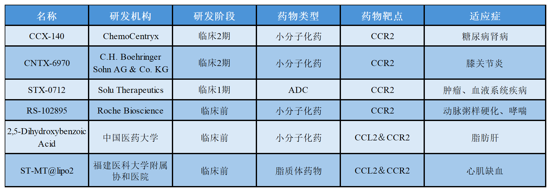 關(guān)于CCL2-CCR2在研的部分藥物進展如下表所示: