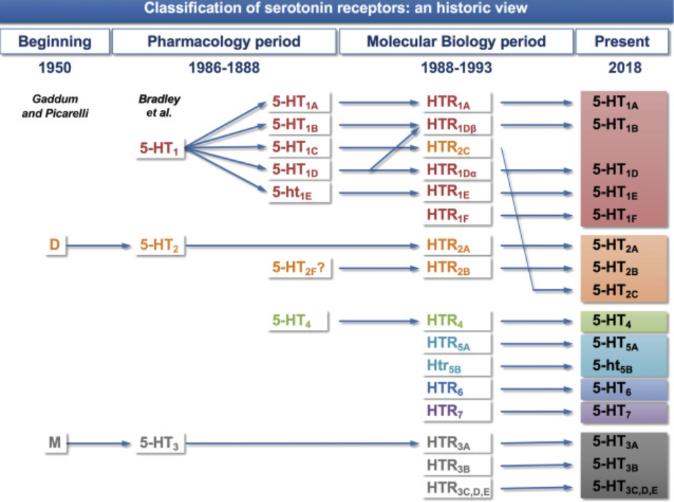 5-HT2家族包括三種受體;5-HT2A、5-HT2B和5-HT2C具有42-51%的總氨基酸序列同源性,并且可以與Gq/G11偶聯(lián)以增加肌醇磷酸鹽的水解并提高細(xì)胞質(zhì)中Ca2+水平。此外,Gq/G11與其他轉(zhuǎn)導(dǎo)途徑(PI3K/Akt和ERK)的偶聯(lián)是明顯的。5-HT2C受體易于進(jìn)行RNA編輯,導(dǎo)致多種不同的亞型,這些亞型可能顯示出改變的轉(zhuǎn)導(dǎo)效率以及優(yōu)選的轉(zhuǎn)導(dǎo)途徑偶聯(lián)。這種RNA編輯可以通過精神藥物進(jìn)行調(diào)節(jié),從而以特定于大腦區(qū)域的方式改變這些受體的功能。