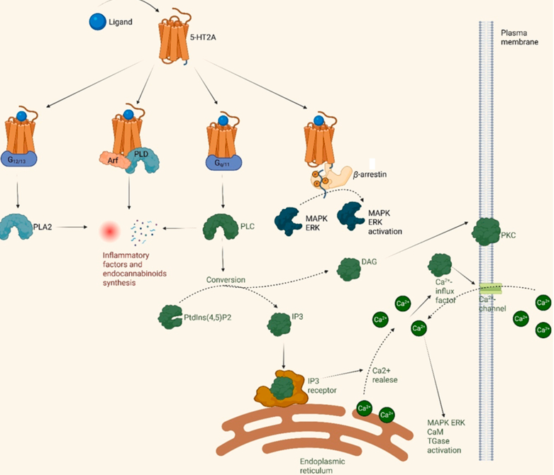 5-HT2A受體廣泛分布于中樞神經(jīng)系統(tǒng)(CNS)和外周組織中。在中樞神經(jīng)系統(tǒng)內(nèi),它主要位于富含血清素的區(qū)域,包括新皮層、嗅結(jié)節(jié)、海馬和杏仁核,以及邊緣和基底神經(jīng)節(jié)結(jié)構(gòu)7。5-HT2A受體在調(diào)節(jié)認(rèn)知、情緒和神經(jīng)可塑性過程中起著關(guān)鍵作用。它在大腦皮層V層錐體神經(jīng)元的頂端樹突上的濃度特別高,能夠通過谷氨酸釋放調(diào)節(jié)和與其他受體系統(tǒng)的相互作用來調(diào)節(jié)工作記憶、注意力和其他執(zhí)行功能。這種受體對海馬和杏仁核功能至關(guān)重要,海馬和杏仁核是參與學(xué)習(xí)、記憶形成和情緒處理的關(guān)鍵結(jié)構(gòu)。這兩個區(qū)域都從中縫核接收密集的5-羥色胺能神經(jīng)支配,5-HT2A受體激活通過增強(qiáng)空間編碼精度、調(diào)節(jié)GABA等中間神經(jīng)元介導(dǎo)的抑制、促進(jìn)記憶鞏固過程等過程調(diào)節(jié)其活性。影響這些過程與神經(jīng)系統(tǒng)疾病的治療有關(guān)。盡管5-HT2A受體拮抗劑(如氯氮平、哌替嗪)和反向或部分激動劑被廣泛用于治療精神分裂癥、認(rèn)知障礙和偏頭痛,但在治療上使用其激動劑具有挑戰(zhàn)性。這種困難是因為受體可以激活不同的效應(yīng)蛋白,特別是Gq和β-arrestin。Gq主要與受體結(jié)合,啟動磷脂酶C(PLCβ)的激活,然后導(dǎo)致肌醇三磷酸(IP3)和二?;视停―AG)等次級信使的產(chǎn)生,導(dǎo)致鈣釋放和蛋白激酶C(PKC)激活12。此外,5-HT2A受體與β-arrestin相互作用,促進(jìn)受體內(nèi)化和脫敏,同時也啟動不同的細(xì)胞內(nèi)信號級聯(lián)。這些機(jī)制導(dǎo)致不同的生理效應(yīng),如抗抑郁藥和致幻結(jié)果。