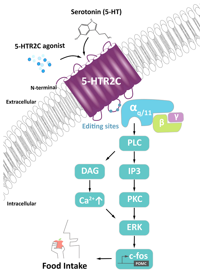 5-HTR2C是首批測序和克隆的5-HT受體之一。編碼5-HTR2C的基因位于人類染色體Xq24上。它含有三個內(nèi)含子(而不是兩個,如5-HTR2A和5-HTR2B),編碼一種具有七個跨膜區(qū)的蛋白質(zhì)產(chǎn)物。小鼠、大鼠和人類跨膜區(qū)5-HTR2C的同源性超過80%。與外周神經(jīng)系統(tǒng)相比,5-HTR2C在中樞神經(jīng)系統(tǒng)(CNS)中廣泛表達(dá)。在中樞神經(jīng)系統(tǒng)中,5-HTR2C在這些與能量代謝相關(guān)的已知腦區(qū)表達(dá),包括腹側(cè)被蓋區(qū)(VTA)、弓狀核(ARC)、孤束核(NTS)、下丘腦室旁核(PVN)和外側(cè)臂旁核(LPBN)。對5-HTR2C功能喪失或獲得的遺傳研究表明,5-HTR2C在這些腦區(qū)維持能量穩(wěn)態(tài)中起著關(guān)鍵作用,已被證明可以調(diào)節(jié)能量穩(wěn)態(tài),包括進(jìn)食和葡萄糖代謝。5-HTR2C的最佳理解功能是通過5-HTR2C在下丘腦的促阿片黑皮質(zhì)素(POMC)神經(jīng)元中的作用來調(diào)節(jié)食物攝入。血清素與5-HTR2C的結(jié)合導(dǎo)致異三聚體G蛋白的解離,該蛋白與5-HTR2C的第二個細(xì)胞內(nèi)環(huán)結(jié)合。解離后,亞基Gα/q11激活磷脂酶C,產(chǎn)生肌醇三磷酸(IP3)和二?;视停―AG),從而激活蛋白激酶C(PKC)。PKC激活細(xì)胞外調(diào)節(jié)激酶(ERK)通路,導(dǎo)致c-Fos磷酸化和POMC合成。POMC被加工成α-黑素細(xì)胞刺激激素(α-MSH),通過黑皮質(zhì)素4受體(MC4Rs)激活PVN中的神經(jīng)元。PVN神經(jīng)元的激活誘導(dǎo)飽腹感,即停止進(jìn)食,這是一種厭食反應(yīng)。