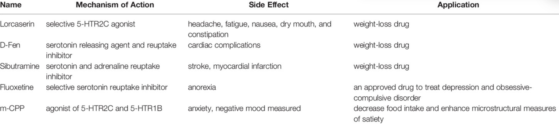 5-HTR2C是新型減肥藥物最有前景的靶點之一。許多靶向5-HT信號傳導(dǎo)的調(diào)節(jié)劑,包括西布曲明(血清素和腎上腺素再攝取抑制劑)、mCPP和芬氟拉明(也稱為氟西汀,選擇性血清素再攝取抑制劑。)已被用作食欲抑制劑。西布曲明和氟西汀可以在體內(nèi)增加細(xì)胞外血清素水平,非選擇性地刺激所有突觸后亞型,然后刺激5-HTR2C抑制食物攝入。Heisler報告稱,mCPP不會抑制5-HTR2C敲除小鼠的食物攝入,也會削弱芬氟拉明(血清素釋放劑和再攝取抑制劑)的吞咽作用,這表明5-HTR2C在d-芬氟拉明誘導(dǎo)飽腹感中起著關(guān)鍵作用。芬氟拉明是一種治療肥胖癥的有效藥物,以Pondimin®/Redux®的名義出售,可以降低食欲。芬氟拉明與血清素5-HTR2C結(jié)合較弱,d-Fen以高親和力結(jié)合并激活血清素5-HTR2B和5-HTR2C,以中等親和力結(jié)合并活化血清素5-HTR2A(115-117)。然而,芬氟拉明與心臟瓣膜病和肺動脈高壓的副作用有關(guān),促使其退出臨床使用。