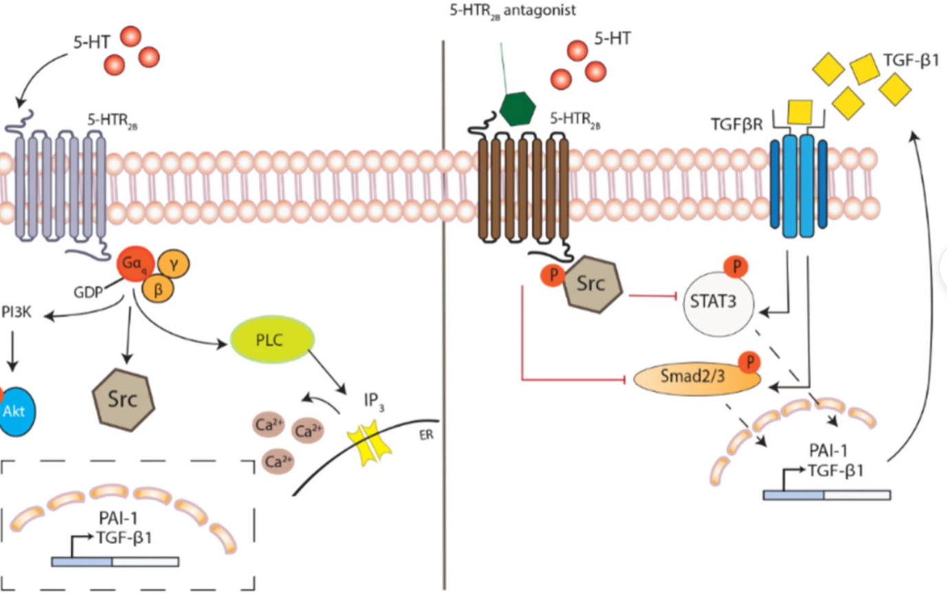 自1992年首次對5-羥色胺2B受體(5-HTR2B)進(jìn)行表征以來,5-HTR2B的研究取得了重大進(jìn)展。有證據(jù)表明,5-HTR2B與心血管系統(tǒng)、纖維化疾病、癌癥、胃腸道(GI)和神經(jīng)系統(tǒng)的調(diào)節(jié)有關(guān)。5-HTR2B與不同配體結(jié)合為配體識別、激活機(jī)制和偏置信號傳導(dǎo)提供了很好的見解。目前已經(jīng)發(fā)現(xiàn)并開發(fā)了許多5-HT2BR拮抗劑(如 RS-127445、PRX-08066等)。