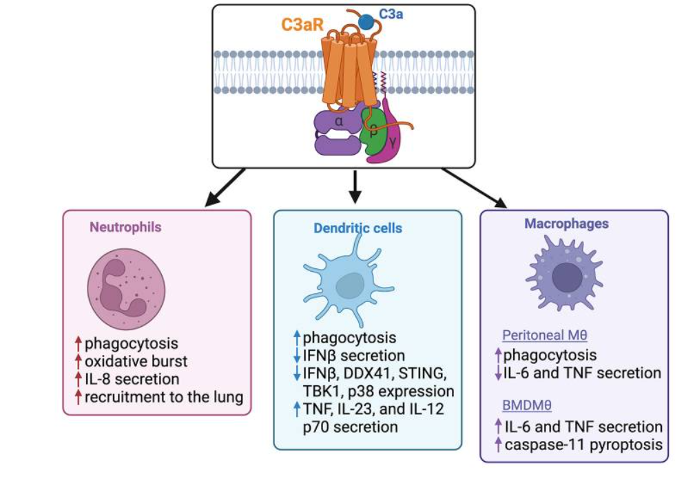 C3aR是G蛋白偶聯(lián)受體(GPCR)家族的成員,其特征是具有七個(gè)跨膜結(jié)構(gòu)域?;谕吹腉蛋白對(duì)C3aR的分類一直具有挑戰(zhàn)性。G蛋白是異三聚體復(fù)合物,在GPCR激活時(shí)解離為Gα和Gβγ亞基。這種解離促進(jìn)了通過第二信使如cAMP和鈣的產(chǎn)生以及下游信號(hào)的調(diào)控。雖然文獻(xiàn)中有些證據(jù)表明C3aR激活會(huì)觸發(fā)Gαi家族,但其他研究表明Gαs和Gαq參與其中。最近一項(xiàng)研究發(fā)現(xiàn),C3aR主要與Gαi/o/z亞型耦合,以抑制cAMP積累并介導(dǎo)鈣回流。C3aR激活下游最常被報(bào)道的影響是細(xì)胞內(nèi)鈣的增加,但其他分子通路如GSK3β、Wnt、ERK、JAK/STAT和HIF1α信號(hào)也被發(fā)現(xiàn)位于C3aR激活的下游。