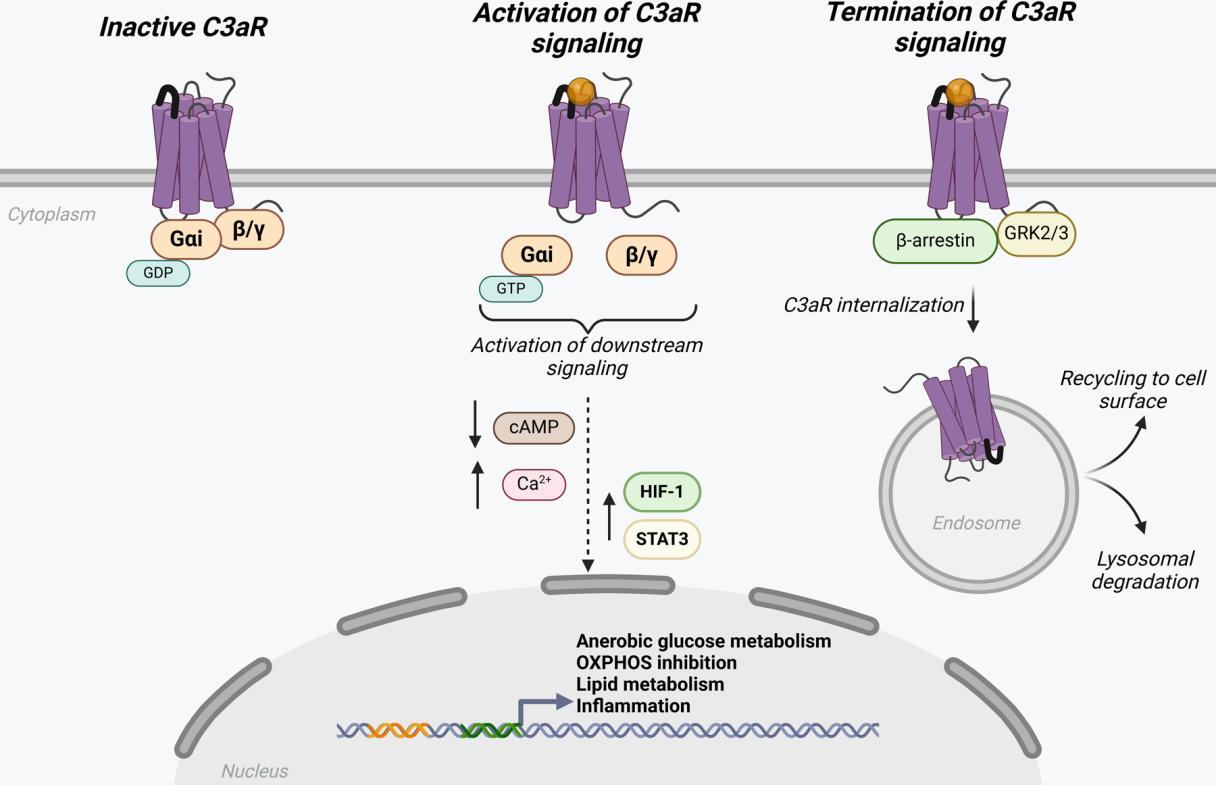 在無活性狀態(tài)下,C3aR與異三聚體G蛋白復(fù)合物的Gαi亞家族結(jié)合。配體結(jié)合(C3a或TLQP-21)后,附著在Gαi上的GDP轉(zhuǎn)化為GTP,導(dǎo)致亞基解離成Gαi和Gβγ。這種解離啟動(dòng)下游信號(hào)級(jí)聯(lián),抑制腺苷酸環(huán)化酶,降低cAMP水平,增加鈣通量。在下游,C3aR激活激活STAT3和HIF-1等轉(zhuǎn)錄因子,啟動(dòng)與炎癥、脂質(zhì)代謝、葡萄糖代謝和OXPHOS抑制相關(guān)的基因轉(zhuǎn)錄。為了終止這一信號(hào)級(jí)聯(lián),GRK2/3磷酸化C3aR的胞質(zhì)環(huán)和尾部,促進(jìn)β-阻滯蛋白識(shí)別并與受體結(jié)合。β-抑制蛋白結(jié)合觸發(fā)受體復(fù)合物的內(nèi)化,然后在核內(nèi)體進(jìn)行分類。該復(fù)合體要么被引導(dǎo)到循環(huán)內(nèi)體,受體再循環(huán)到細(xì)胞表面,要么被送到溶酶體降解。