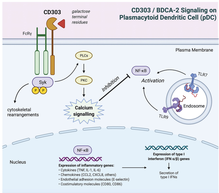 BDCA-2 (blood DC antigen 2血液樹突狀細胞抗原2)又叫CLEC4C或CD303,是人類pDCs特有的II型c型凝集素受體(CLR),與TLR-7/9協(xié)同識別微生物和協(xié)調(diào)炎癥免疫反應(yīng)。BDCA-2是一種可溶性跨膜糖蛋白,由聚集在12號染色體上的c型凝集素編碼基因編碼,包括KLRG1和CLEC4A。與其他CLR類似,BDCA-2具有單個胞外碳水化合物識別結(jié)構(gòu)域,并且在其短細胞質(zhì)尾部缺乏固有的信號基序。BDCA-2選擇性地與IgG分子上的半乳糖端聚糖結(jié)合,產(chǎn)生抗炎反應(yīng)來抵抗因為通過抗原吸收、內(nèi)化、呈遞給T細胞以及信號通路如IFN-I,NF-kB等其他炎性體激活。BDCA-2與跨膜區(qū)的FcRγ鏈形成adaptor,允許酪氨酸激酶募集磷酸化以及鈣動員,類似于b細胞受體(BCR)信號體,BDCA-2信號通過免疫受體酪氨酸激活發(fā)生基序(ITAM)介導(dǎo)的酪氨酸(Syk)磷酸化,磷脂酰肌醇特異性磷酯酶(PLCγ2),PKC的激活等誘導(dǎo)鈣流入并在pDC中充當(dāng)負調(diào)節(jié)劑,介導(dǎo)IFN-Ⅰ抑制并通過BDCA2觸發(fā)減少NFKB的激活。